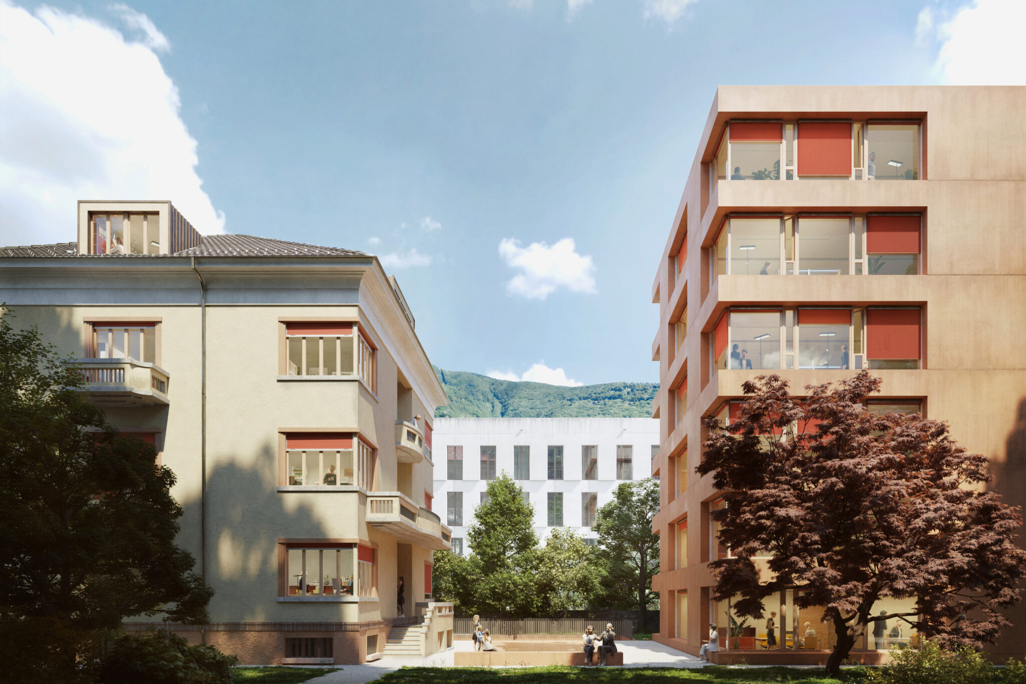 Il progetto risponde all’obiettivo del concorso: creare un insieme armonioso e funzionale tra Villa Trainoni e il nuovo edificio amministrativo. La proposta introduce un volume di sei piani, che sfrutta l’altezza massima consentita per liberare il giardino e l’area verde. L’edificio è collocato lungo il confine del lotto, così da consentire una futura espansione e lasciare libera la facciata sud-ovest della villa, migliorandone l’illuminazione naturale e le visuali. Il nuovo volume dialoga con quello storico, pur distaccandosene attraverso un linguaggio più essenziale e in linea con l’estetica contemporanea. Il parallelismo tra i due edifici emerge nella scelta dei setti portanti perimetrali e del vano scala centrale, che consentono di mantenere gli angoli vetrati, richiamando quelli della villa esistente. Le facciate in calcestruzzo pigmentato riprendono la tonalità dello zoccolo storico, creando continuità cromatica. Anche il progetto paesaggistico punta a valorizzare le alberature esistenti e a creare un nuovo spazio pubblico tra i due edifici: una piazza caratterizzata da uno specchio d’acqua che svolge funzione climatica e di gestione delle acque meteoriche, reinterpretando la fontana prevista nei piani storici. Gli interventi sulla villa sono misurati e rispettosi, tra cui l’inserimento di tre nuovi abbaini che permettono di accogliere funzioni amministrative a reddito con vista sugli edifici storici e pubblici dell’intorno.